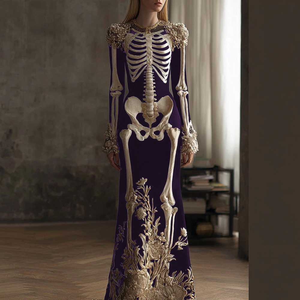 Women's Halloween Retro Anatomy Art And Flower Gothic Velvet Long Dress